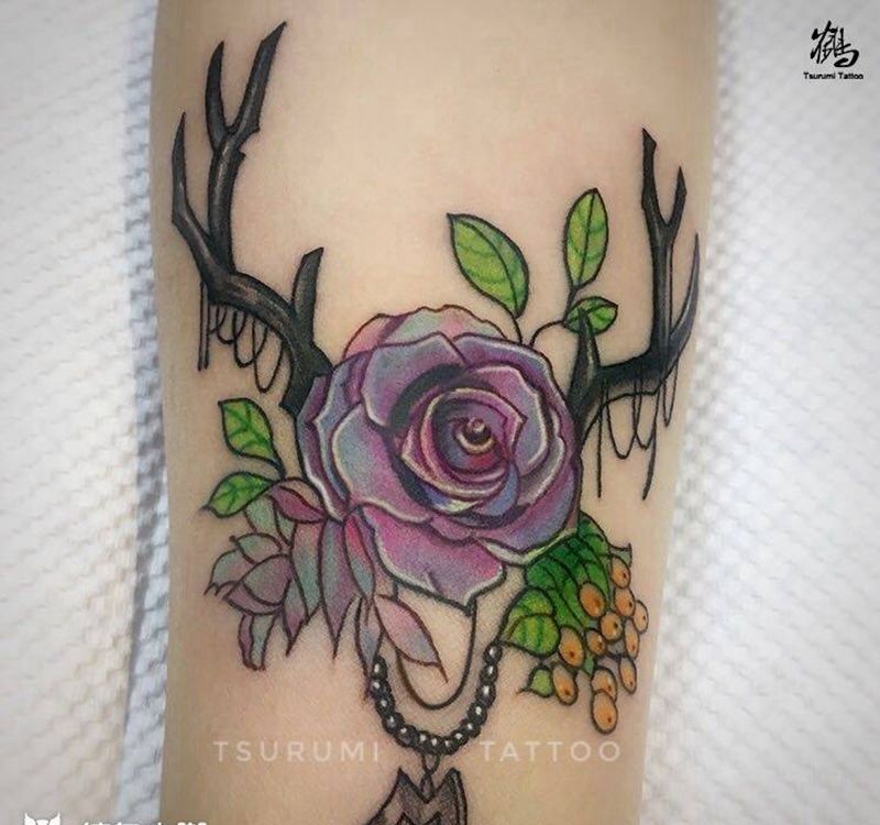 鹤见原创【鹿角玫瑰M】纹身图片_成品手稿手臂清新植物字符原创动物纹身图案
