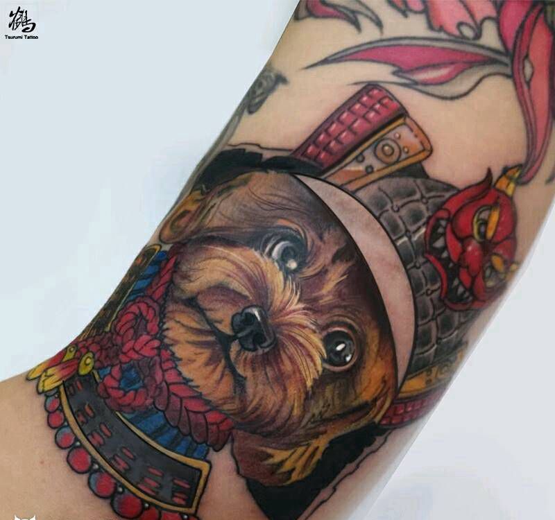 当前位置: 首页 >北京市纹身店-鹤见刺青処纹身图案>鹤见原创【武士泰迪】纹身图片_手臂肖像清新写实动物鬼神原创成品纹身图案