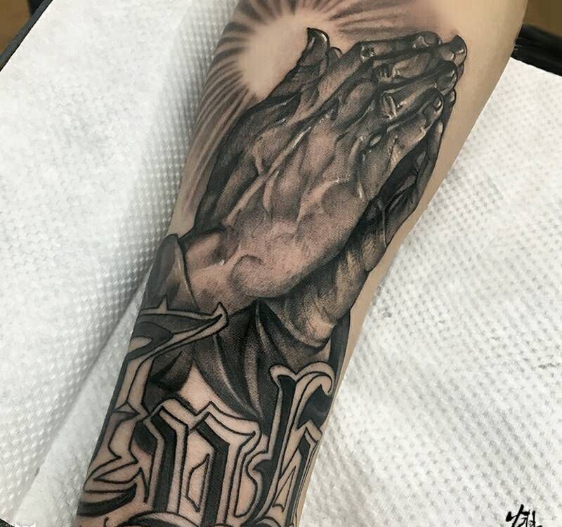 【祈祷之手】纹身图片_手臂欧美传统写实鬼神图腾宗教原创成品纹身图案