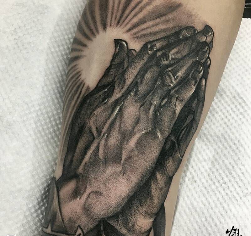 【祈祷之手】纹身图片_手臂欧美传统写实鬼神图腾宗教原创成品纹身图案