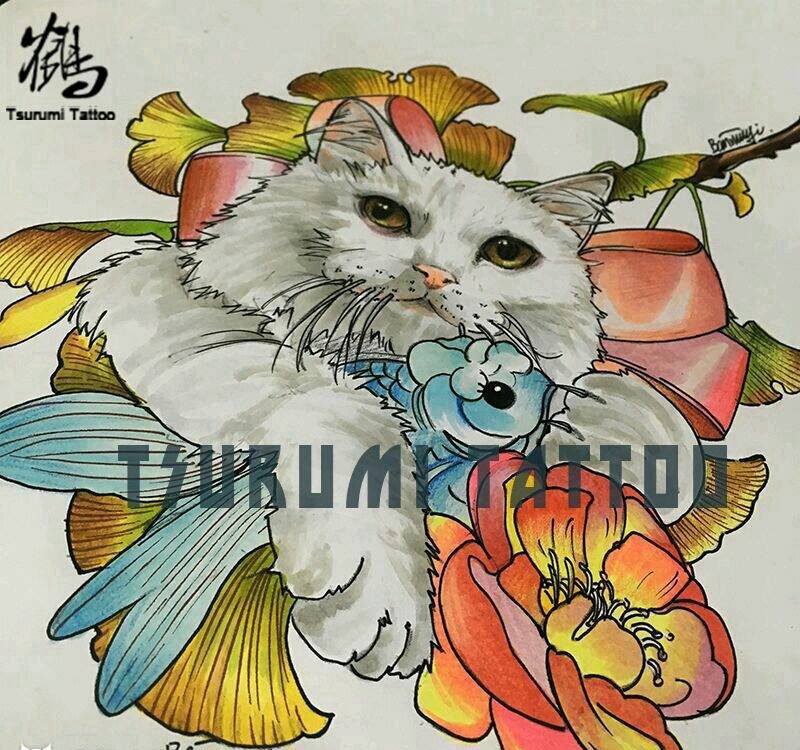 鹤见原创【银杏猫鱼】纹身图片_手臂清新写实动物植物静物原创成品手稿纹身图案