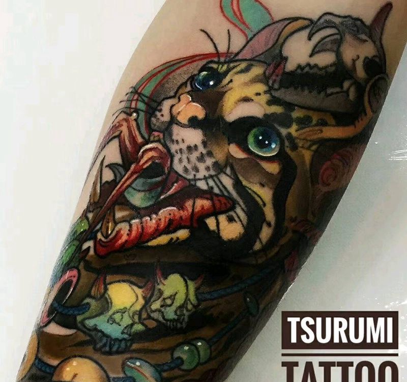 当前位置: 首页 >北京市纹身店-鹤见刺青処纹身图案>鹤见原创【寄生豹猫】纹身图片_手臂欧美传统肖像写实动物鬼神原创成品纹身图案