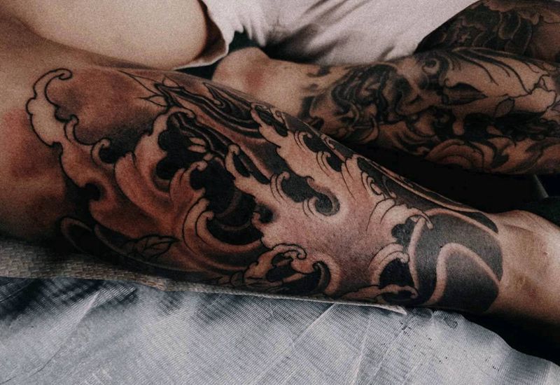 • T网红王老大花腿龙纹身图片_腿部新传统纹身图案