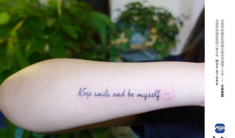 当前位置: 首页 >北京市纹身店-MDZ STORE流行文化体验店纹身图案>Keep smile and be myself纹身图片_手臂文字纹身图案