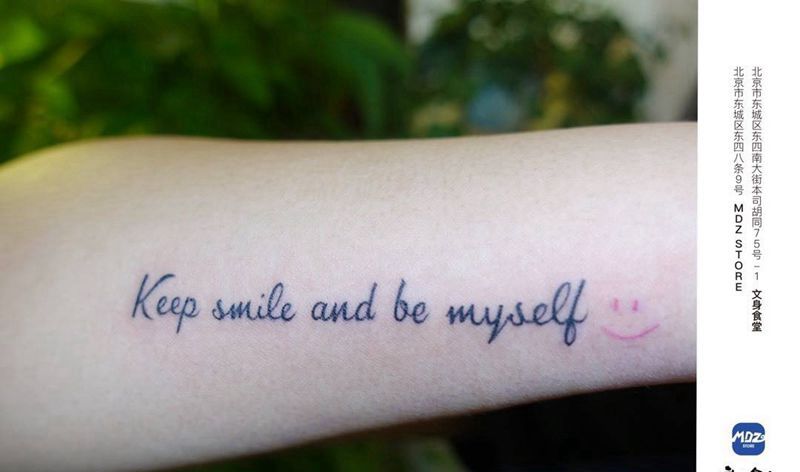当前位置: 首页 >北京市纹身店-MDZ STORE流行文化体验店纹身图案>Keep smile and be myself纹身图片_手臂文字纹身图案