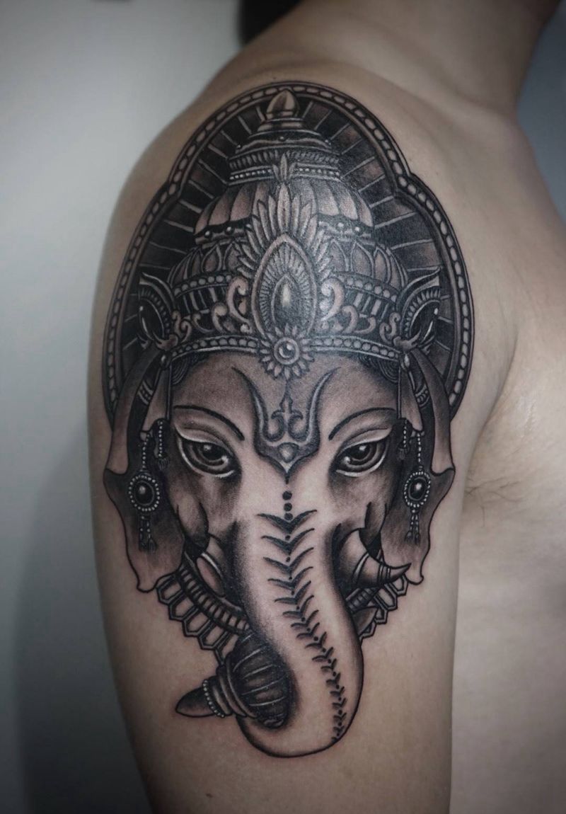 当前位置: 首页 >北京市纹身店-工匠刺青纹身图案>象神纹身图片_肩部手臂新传统象神纹身图案
