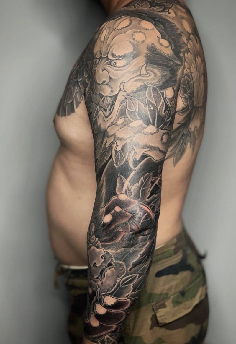 当前位置: 首页 >北京市纹身店-工匠刺青纹身图案>唐狮花臂纹身图片_手臂肩部老传统新传统纹身图案