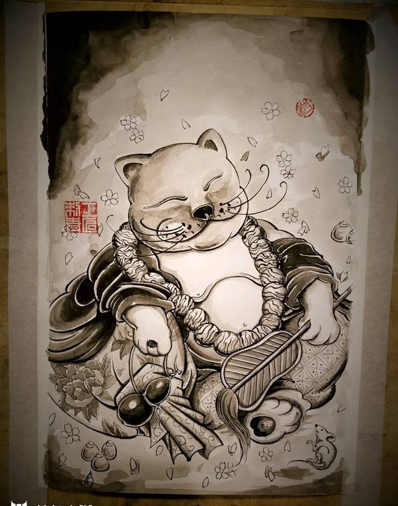布袋猫纹身图片_肩部腹部手臂腿部传统习俗动物宗教原创手稿纹身图案