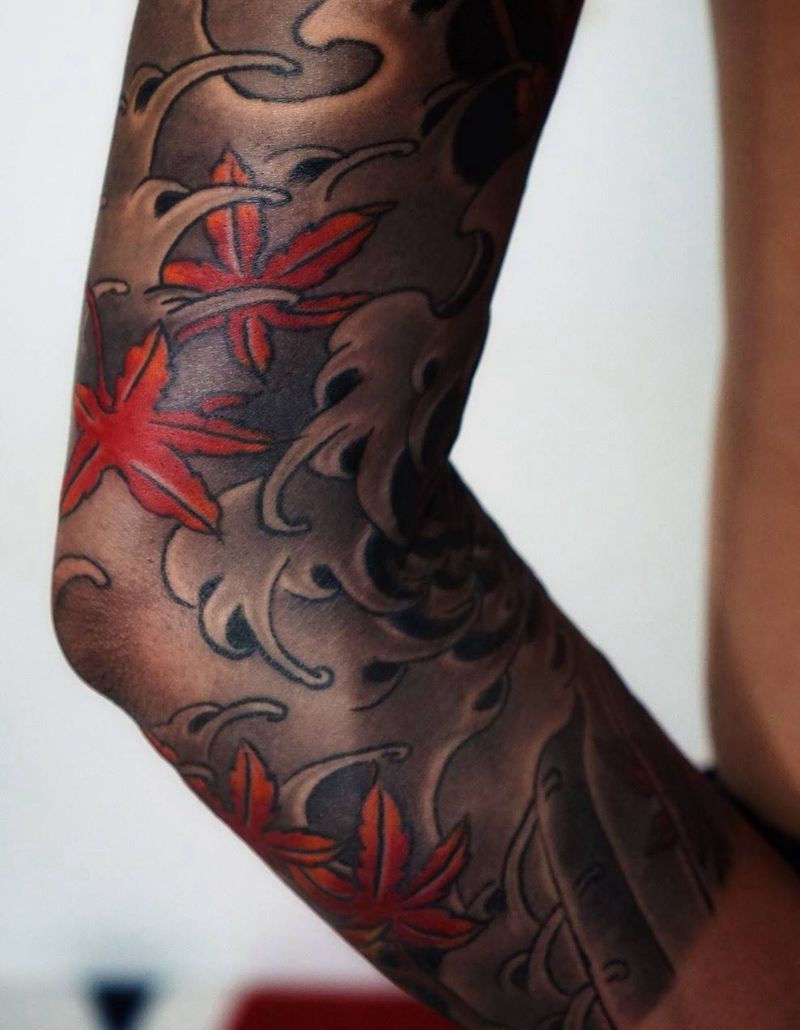 当前位置: 首页 >北京市纹身店-工匠刺青纹身图案>七分袖花臂遮盖纹身图片_