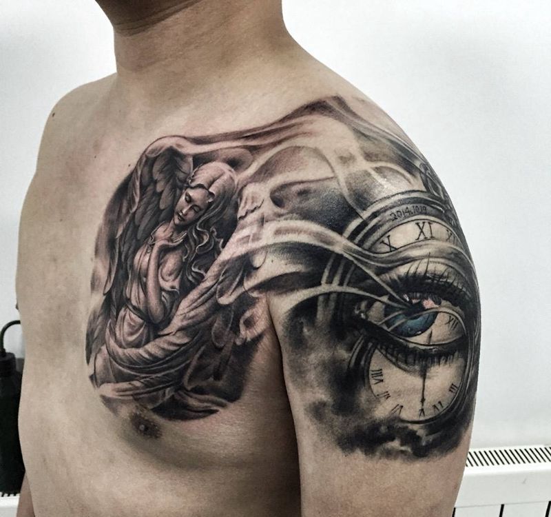半甲纹身图片_成品肩部写实肖像欧美原创人物宗教纹身图案