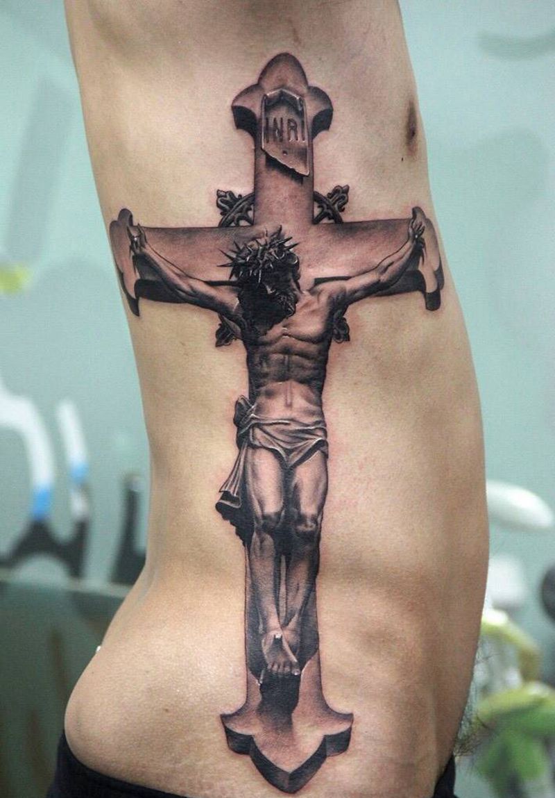 耶稣恢复前后。纹身图片_腰部成品欧美写实肖像人物原创宗教纹身图案