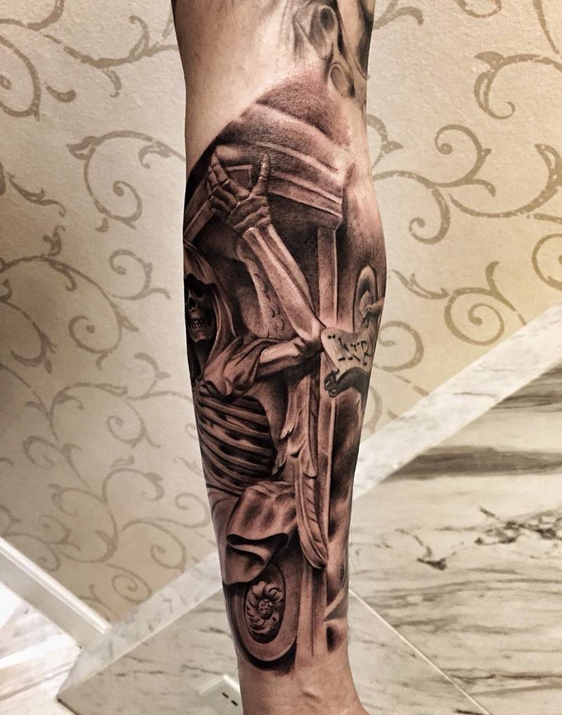 当前位置: 首页 >北京市纹身店-纯刺青纹身图案>地狱天使纹身图片_成品写实欧美肖像手臂原创宗教纹身图案