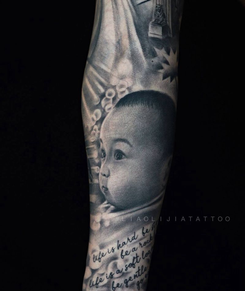当前位置: 首页 >北京市纹身店-纯刺青纹身图案>亲情、爱情、成长。过去、未来、当下。纹身图片_成品手臂写实肖像欧美原创人物纹身图案