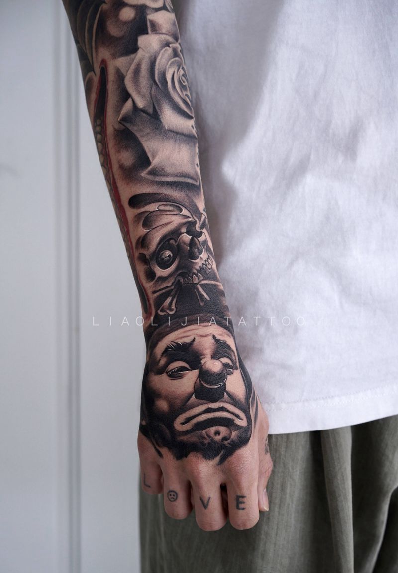 当前位置: 首页 >北京市纹身店-纯刺青纹身图案>小丑骷髅与玫瑰纹身图片_手臂欧美写实小丑骷髅手面纹身图案