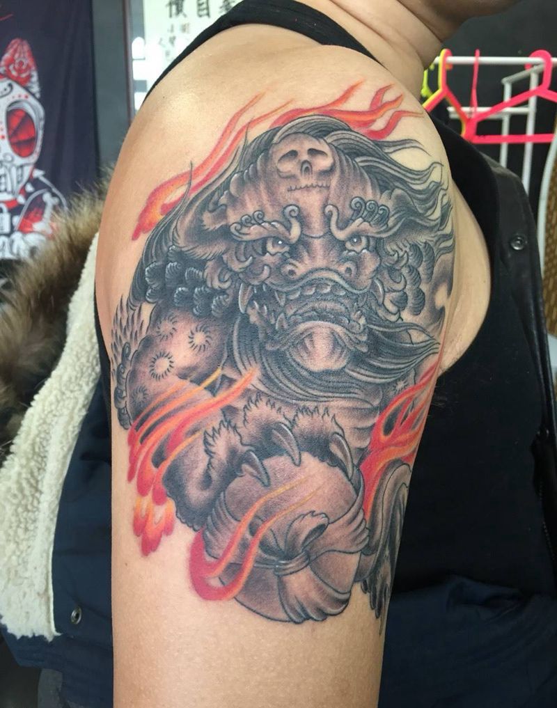 唐狮子纹身图片_手稿手臂传统动物宗教鬼神情侣纹身图案