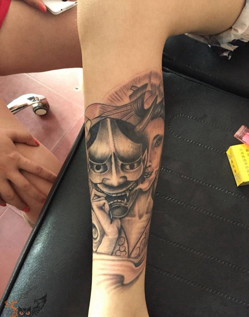 艺伎&般若纹身图片_清新肖像欧美传统写实人物鬼神宗教腿部脚部纹身图案