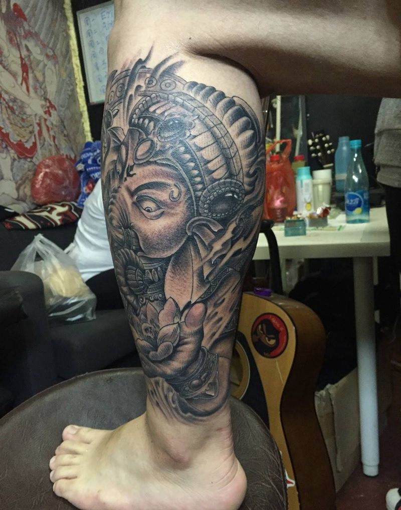 • T包小腿吹火男+阿多福纹身图片_腿部老传统新传统吹火男阿