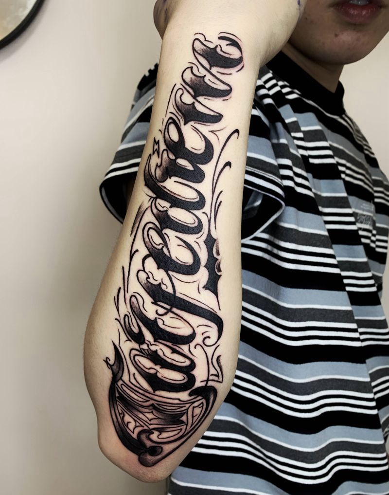 当前位置: 首页 >北京市纹身店-第一次文身纹身图案>奇卡诺纹身图片_手臂花体字纹身图案