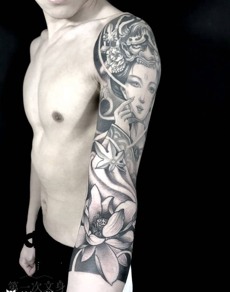 当前位置: 首页 >北京市纹身店-第一次文身纹身图案>艺伎荷花七分袖纹身图片_腰部背部手臂腿部传统几何荷花艺伎成品纹身图案