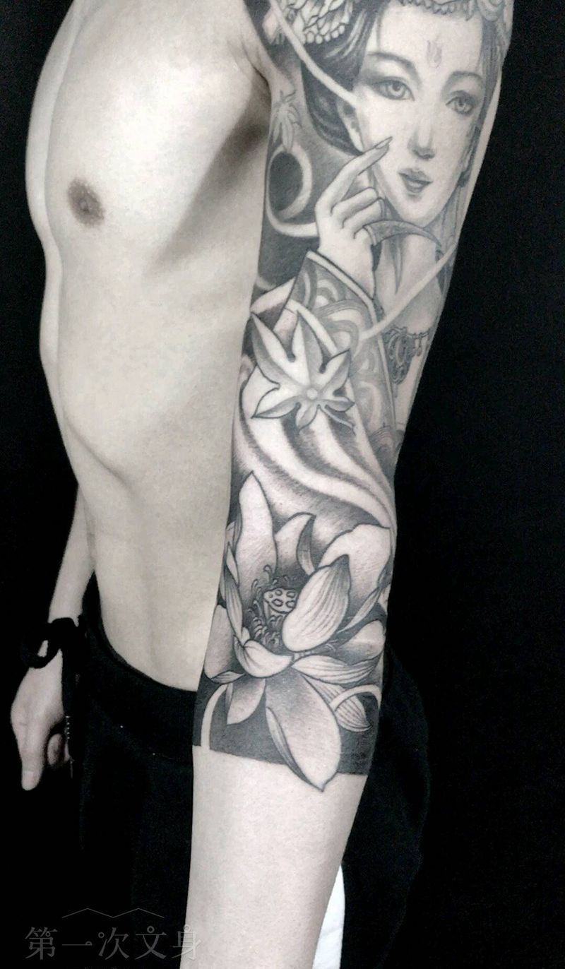 当前位置: 首页 >北京市纹身店-第一次文身纹身图案>艺伎荷花七分袖纹身图片_腰部背部手臂腿部传统几何荷花艺伎成品纹身图案