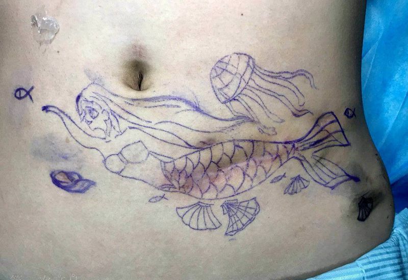 术后伤疤遮盖纹身图片_腰部背部手臂腿部欧美清新美人鱼成品纹身图案