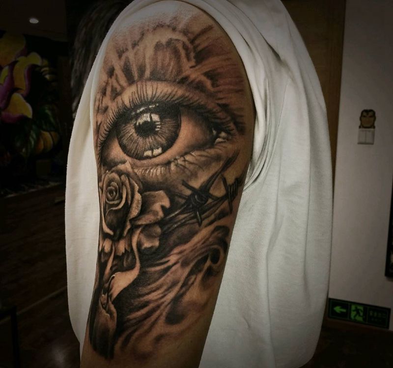 • 手背潮流时尚的玫瑰花眼睛纹身图案