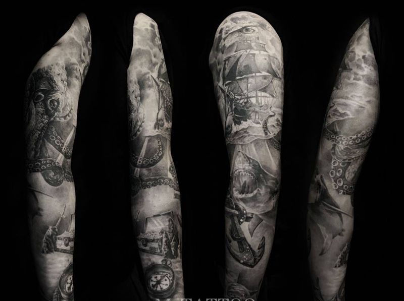 当前位置: 首页 >北京市纹身店-名刺青工作室纹身图案>黑灰写实整臂纹身图片_