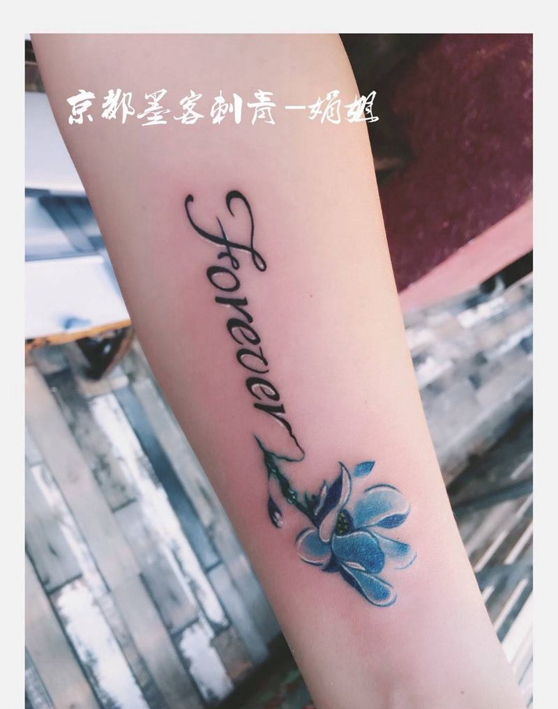 京都墨客刺青-娟姐纹身图片_原创清新颈部手臂成品字母植物纹身图案