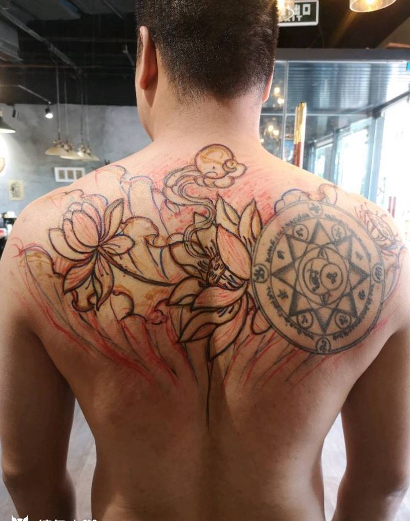 纹身/刺青/纹身修改纹身图片_背部新传统水彩荷花莲花纹身修改纹身图案