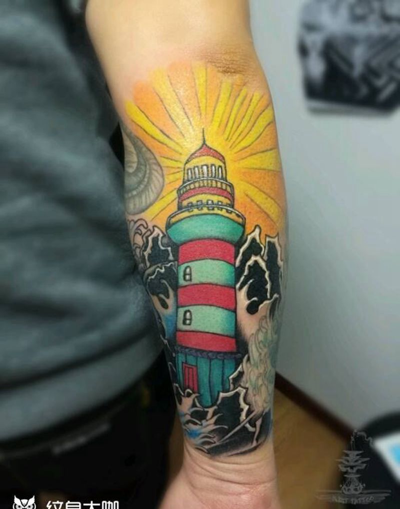 灯塔,照亮前方的路。纹身图片_手臂欧美清新静物彩色花臂灯塔成品纹身图案