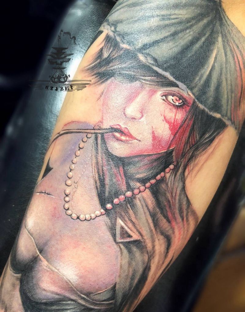 当前位置: 首页 >北京市纹身店-北京舟添刺青纹身图案>幽冥公主纹身图片_成品手臂欧美写实鬼神原创人物纹身图案