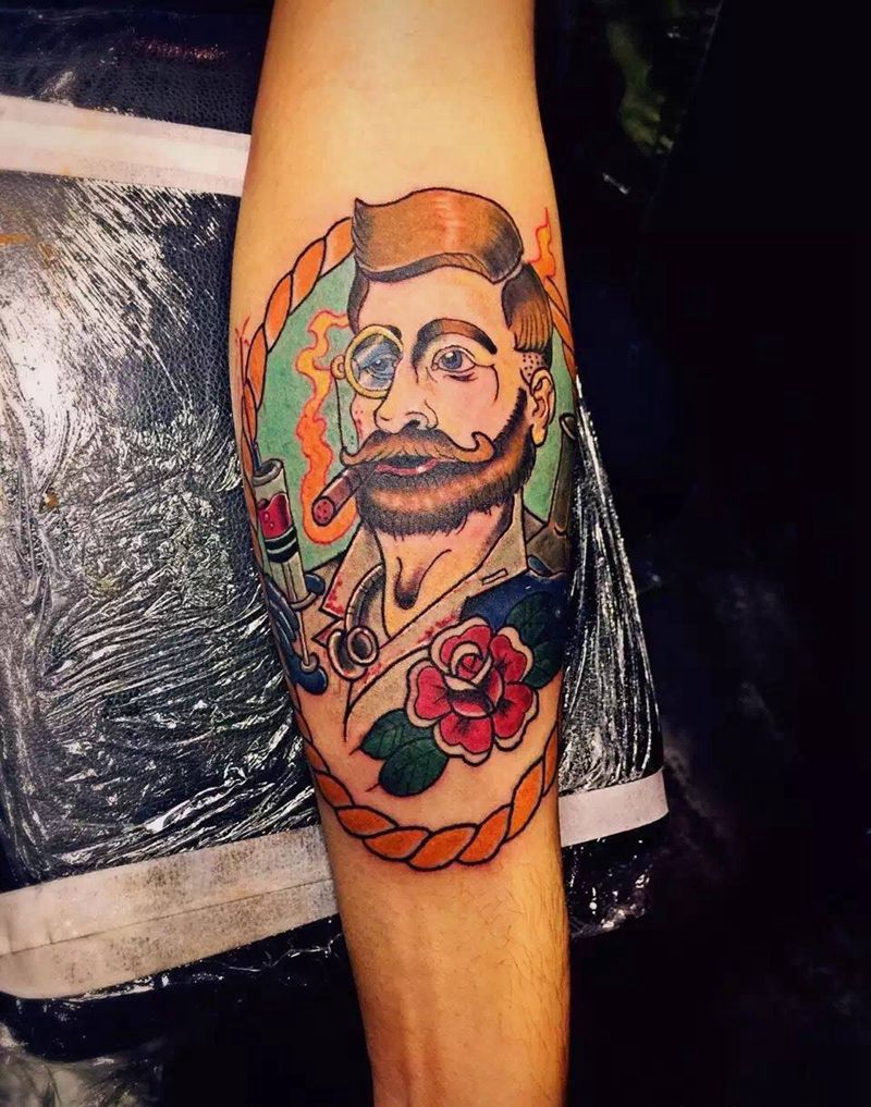 推针管的男医生纹身图片_成品手臂欧美人物原创手稿纹身图案