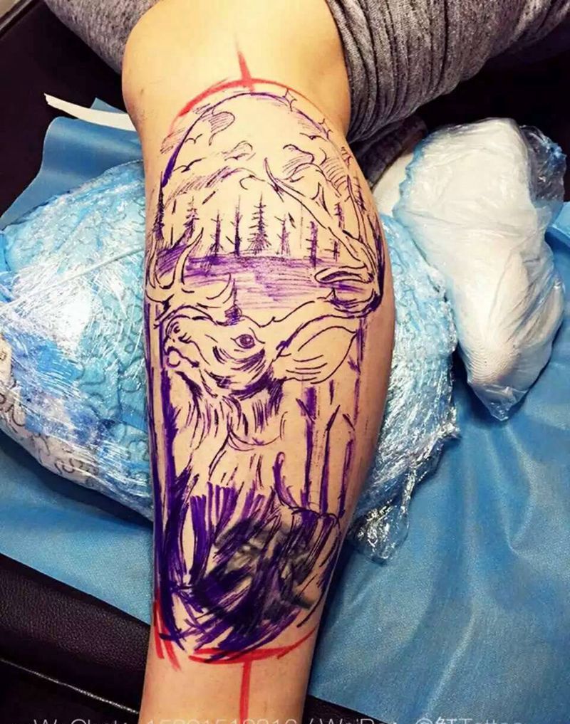 遮盖--傲娇的麋鹿纹身图片_成品腿部欧美动物原创手稿纹身图案