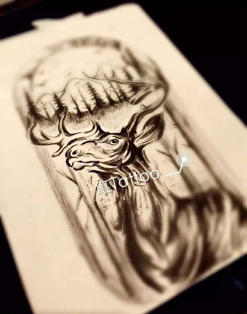 遮盖--傲娇的麋鹿纹身图片_成品腿部欧美动物原创手稿纹身图案