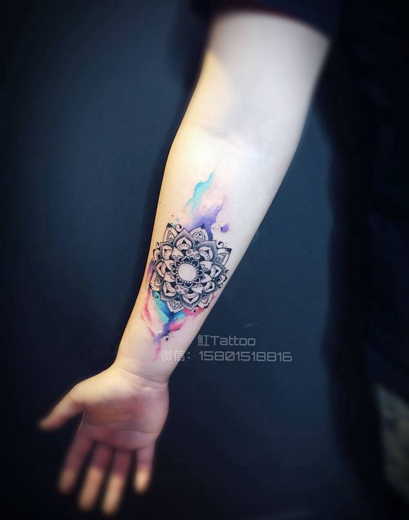 水彩曼陀罗纹身图片_成品手臂清新几何植物纹身图案