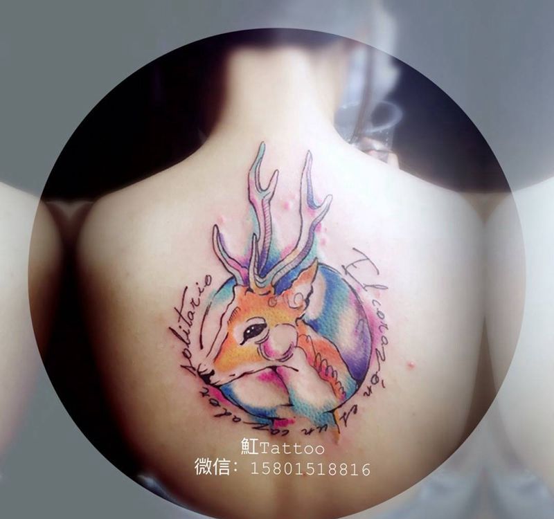 水彩麋鹿~纹身图片_成品背部清新动物纹身图案