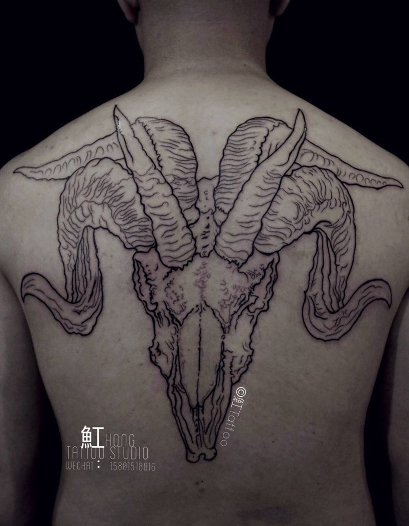 当前位置: 首页 >北京市纹身店-魟Tattoo-纹身设计工作室纹身图案>羊头纹身图片_成品背部欧美写实宗教动物肖像纹身图案