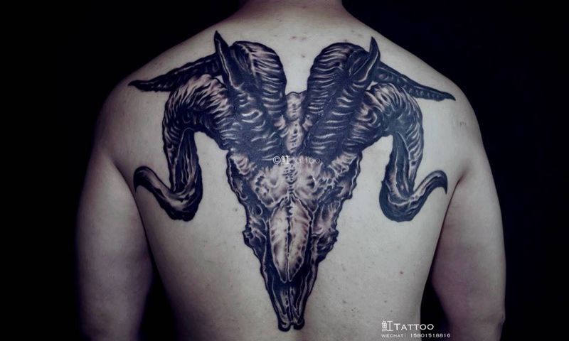 当前位置: 首页 >北京市纹身店-魟Tattoo-纹身设计工作室纹身图案>六角骷髅羊头纹身图片_成品背部欧美写实动物肖像鬼神宗教纹身图案