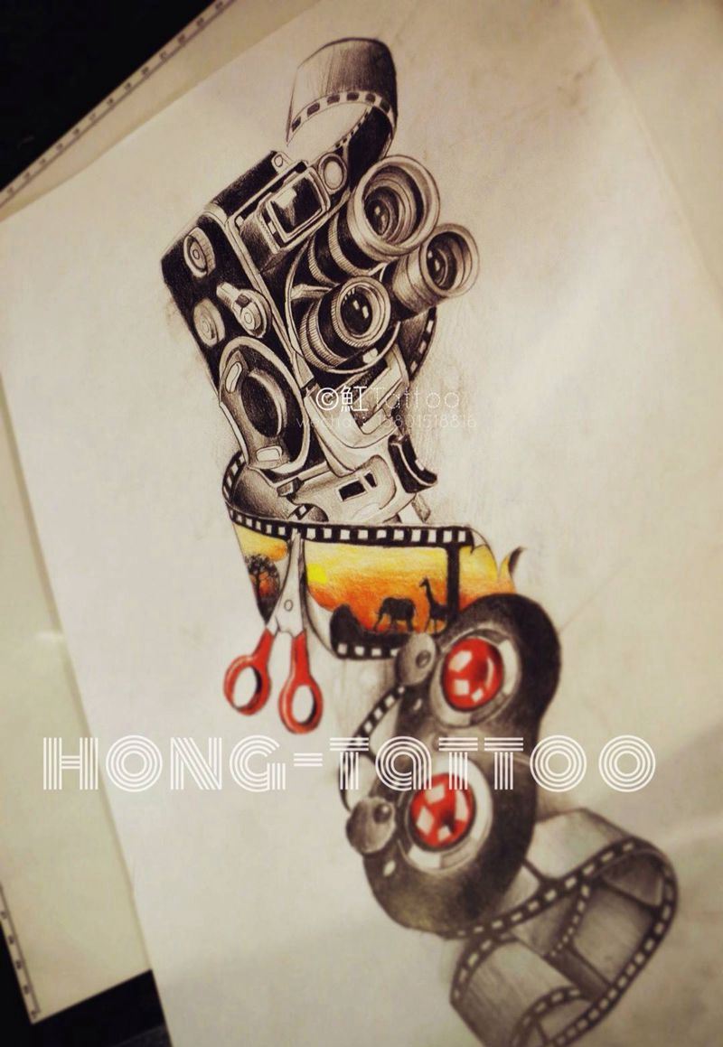 摄像机纹身图片_成品手稿腿部欧美写实原创静物手臂纹身图案