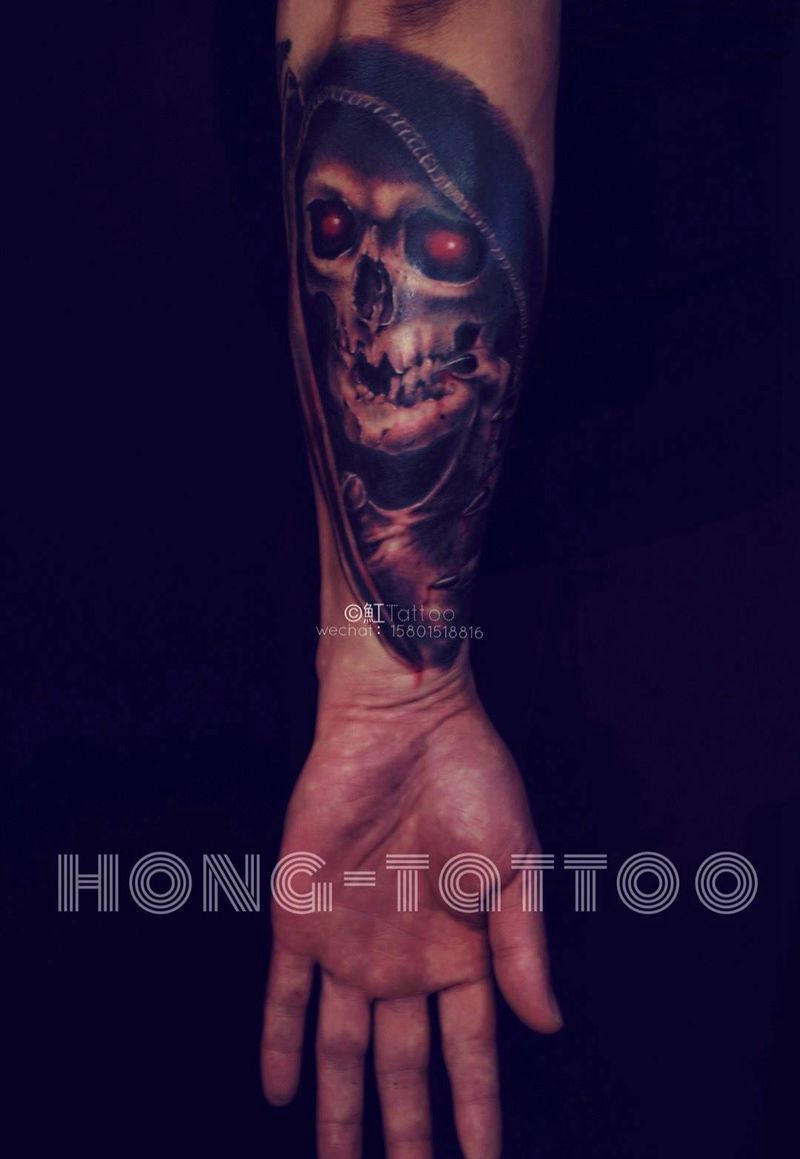 当前位置: 首页 >北京市纹身店-魟Tattoo-纹身设计工作室纹身图案>死神纹身图片_成品手臂欧美肖像原创人物鬼神写实纹身图案