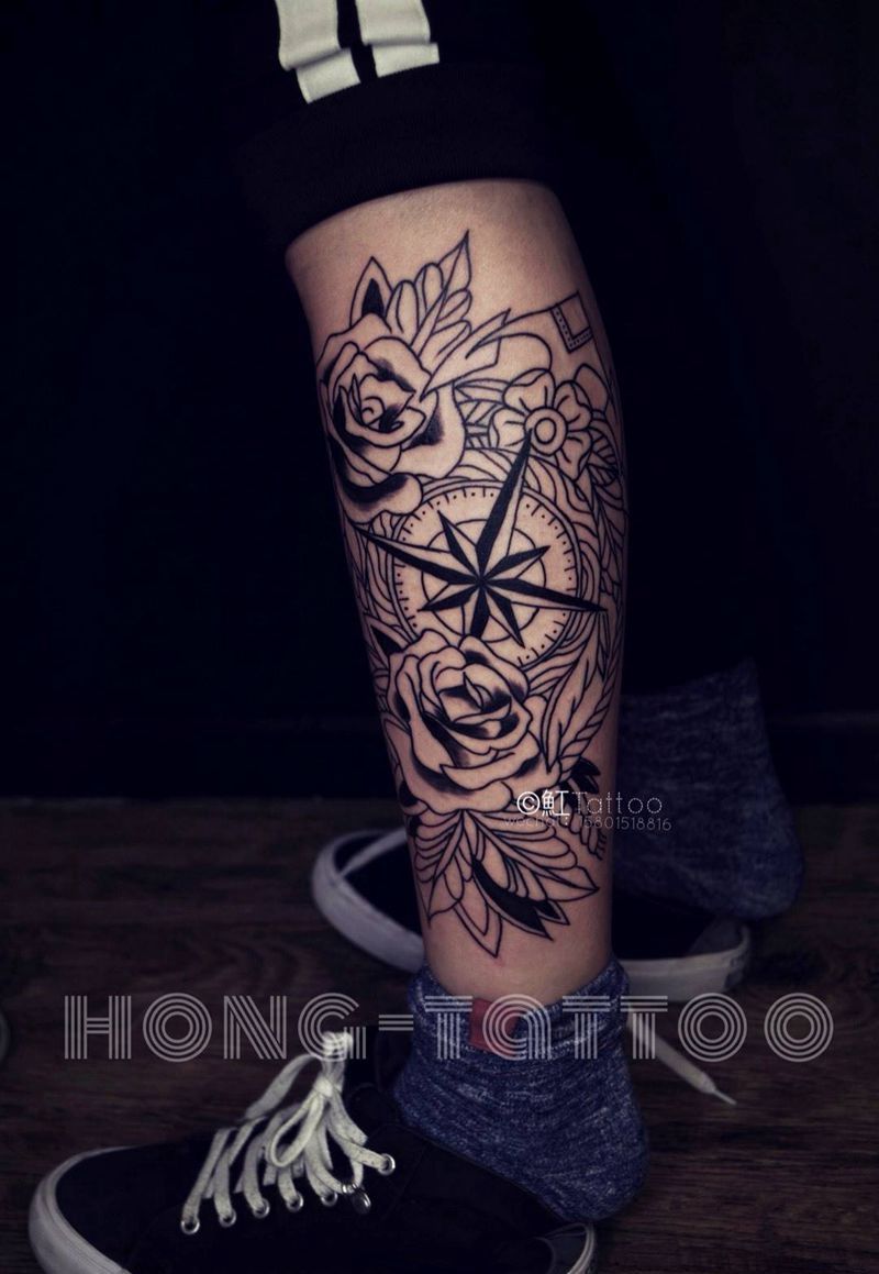 指南针+玫瑰纹身图片_成品手稿腿部欧美原创植物静物纹身图案