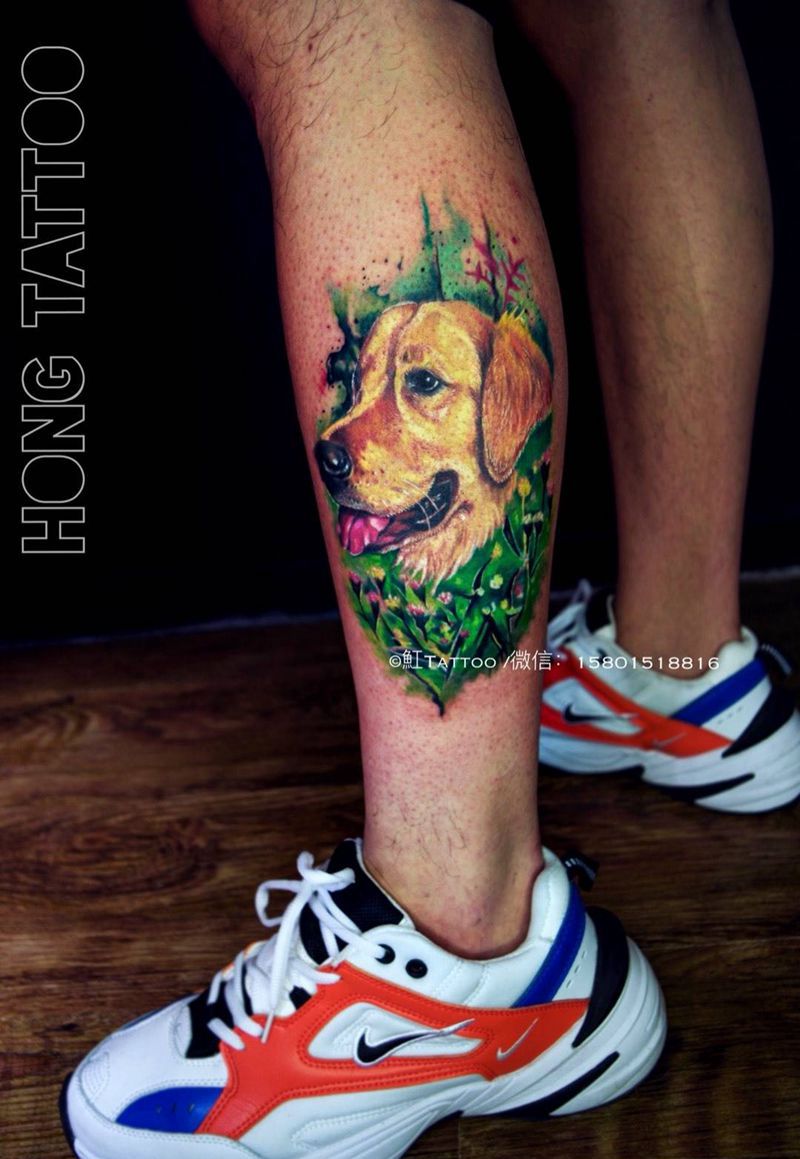 爱犬-金毛纹身图片_腿部水彩欧美写实狗纹身宠物纹身金毛纹身纹身图案