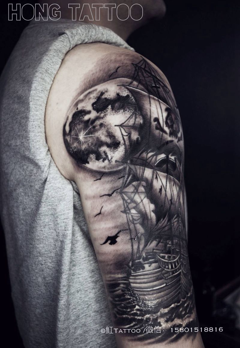 帆船⛵️纹身图片_手臂脚部欧美写实点刺帆船海盗船欧美写实纹身图案