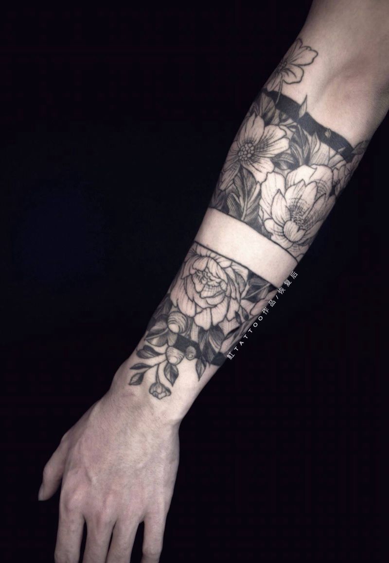 花臂纹身图片_手臂点刺花臂花清新花纹身图案