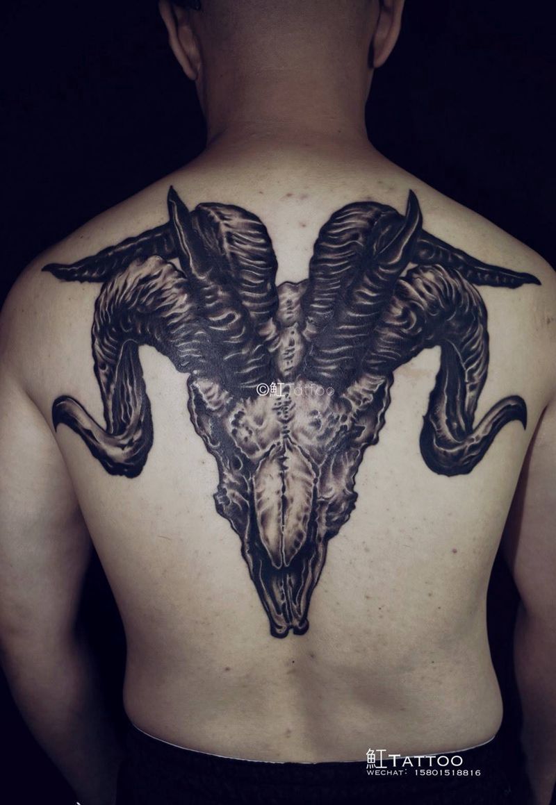 骷髅羊骨纹身图片_背部欧美写实羊骨撒旦骷髅羊纹身图案