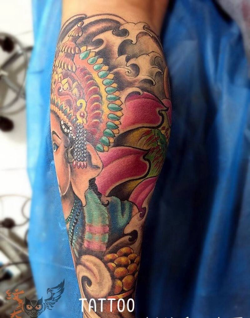 当前位置: 首页 >北京市纹身店-北京和刺纹身艺术工作室纹身图案>象神纹身图片_成品腿部手臂传统动物宗教图腾原创纹身图案