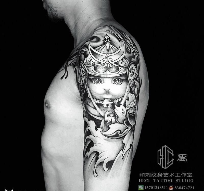 猫武士纹身图片_成品手臂传统清新动物猫纹身图案