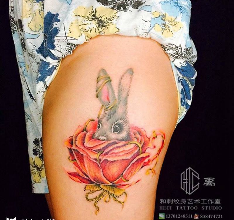当前位置: 首页 >北京市纹身店-北京和刺纹身艺术工作室纹身图案>兔子纹身图片_成品腿部欧美写实清新动物兔子花纹身图案