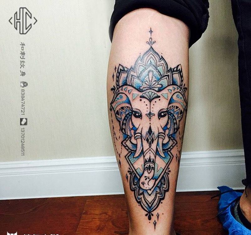 当前位置: 首页 >北京市纹身店-北京和刺纹身艺术工作室纹身图案>象纹身图片_成品腿部传统清新宗教动物象神纹身图案