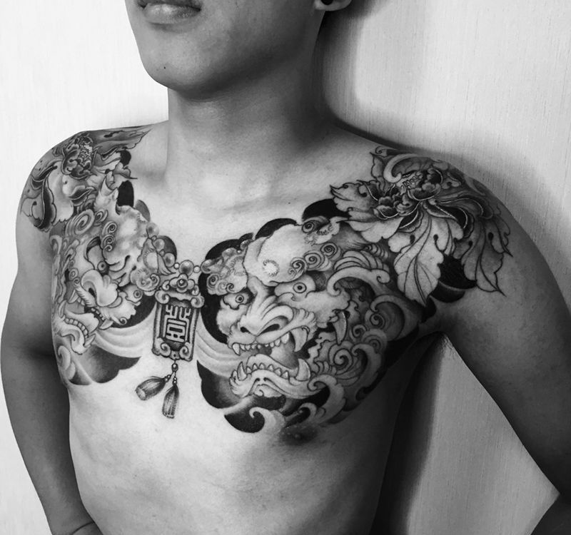 唐狮子,双半甲纹身图片_成品胸部肩部手臂传统字符动物狮子唐狮子纹身图案
